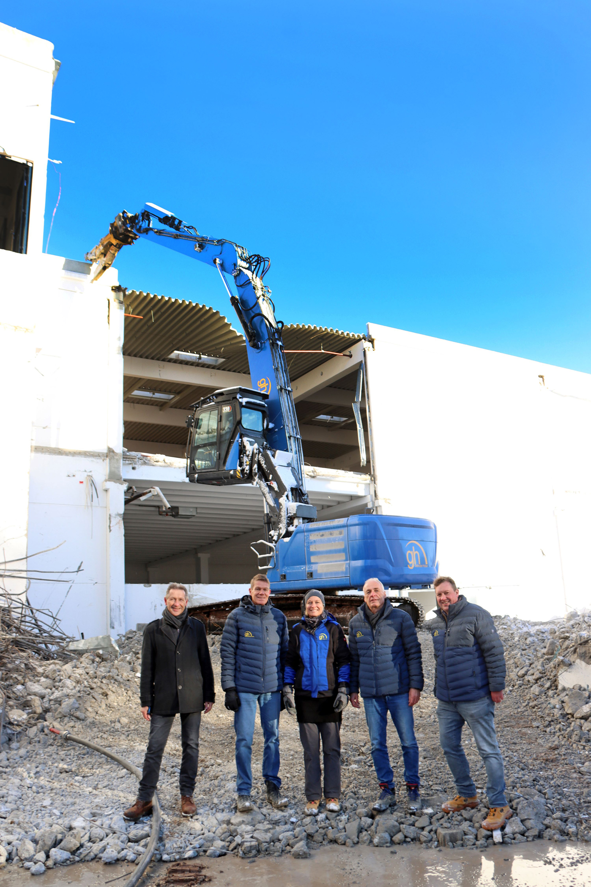 „Nach Möglichkeit streben wir eine Wiederverwendung oder Verwertung vor Ort an, doch das ist nicht immer möglich“, meint Michael Becker von der Geschäftsführung des Unternehmens. Daher wird dann Technologie in Form neuer Assistenzsysteme genutzt, um so die Auswirkungen auf die Stoffströme positiv zu beeinflussen. Dafür wird auf einen modernen Gerätepark auf neuestem Stand der Technik geachtet. „Keine der auf der Baustelle eingesetzten Maschinen ist älter als zwei Jahre. Radlader und Bagger sorgen allesamt dafür, dass der Spritverbrauch der Arbeitsmaschinen niedrig bleibt“, erklärt Karl Huber, Projektleiter für den Abbruch. Aber auch die Maschineneinteilung auf der Baustelle und Ausrüstung der Arbeitsgeräte orientiert sich an einem nachhaltigen Einsatz. So wurde extra in einen Cat 330 MHD investiert, um auf eine sogenannte Zwischenlösung zugreifen zu können. „Aus Sicht der Bauleitung ist es für Arbeiten im selektiven Rückbau wirtschaftlich, wenn wir genau so eine Maschine mit einer hydraulisch hochfahrbaren und um 30 Grad kippbaren Kabine haben, da wir viele große Abbruchprojekte realisieren und auf eine hohe Abbruchleistung angewiesen sind. Für den Fahrer bietet sich so auch ein besserer Überblick, wenn er den Greifer oder die Schere ansetzt, um das Gebäude präzise in der Höhe zu bearbeiten“, meint Karl Huber.