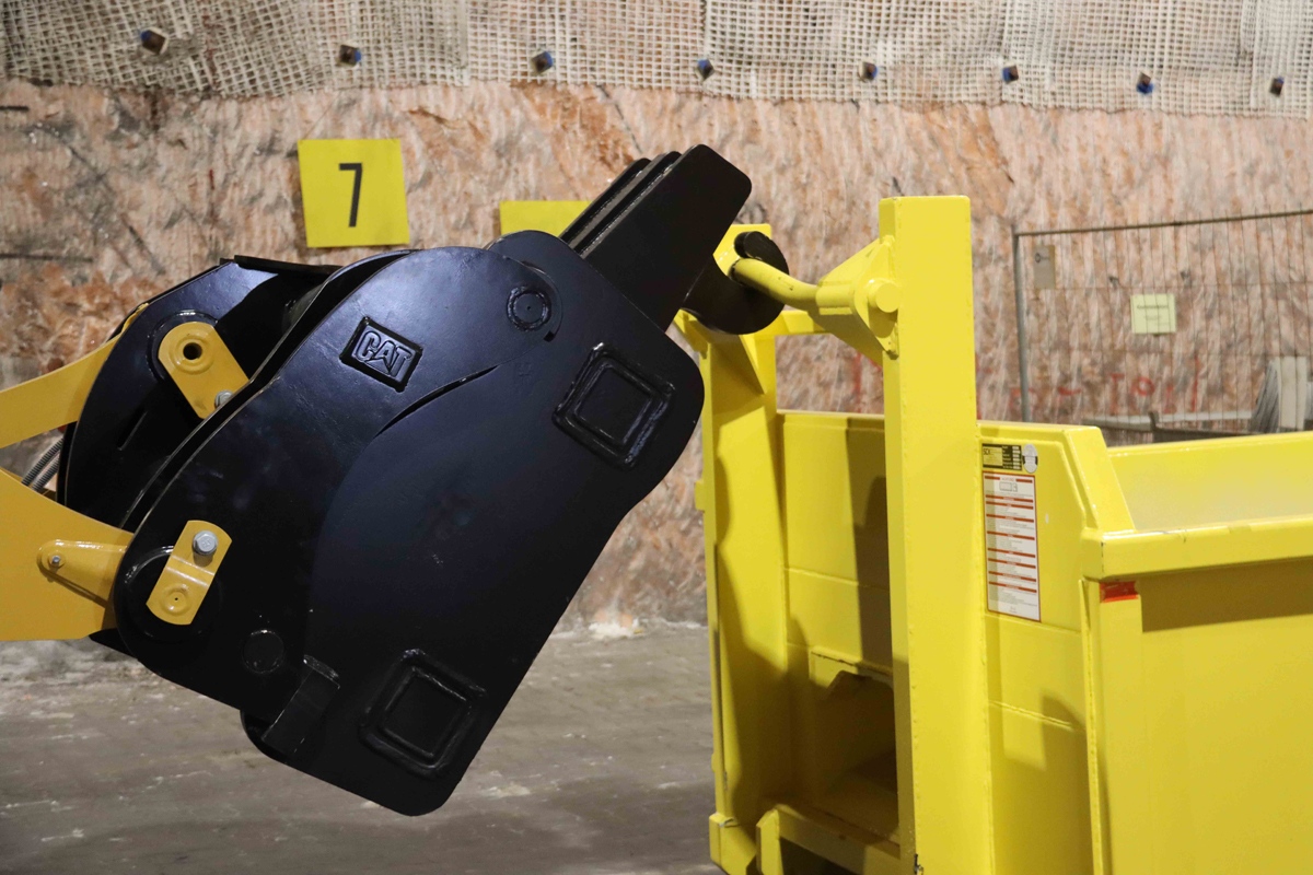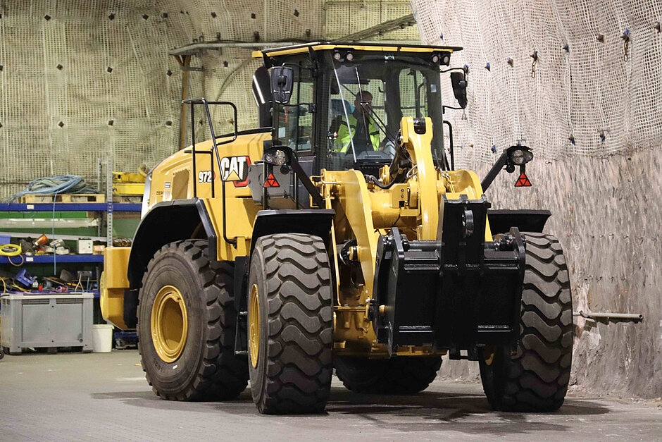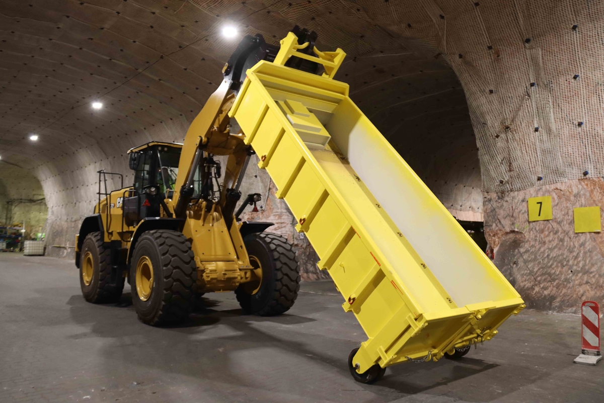 Aufgabe des Radladers ist es, Abrollcontainer anzuheben und zu ziehen. „Hier ist noch etwas Übung gefragt, aber das wird sich schnell einspielen und es wird Routine werden“, räumt Felix Neukirchner ein. Dabei muss der Fahrer darauf achten, den Kippwinkel einzuhalten. Der Cat 972 bringt die Mulde zu einem Lagerplatz, wo das Salz mit einem kleineren Cat Radlader 920 aufgehaldet wird, bevor es seine letzte Reise antritt. „Anfangs werden die Wege weit sein, bis der Kettenlader das Salz in die Hohlräume eingebracht hat“, meint Felix Neukirchner. Dabei sollen spezielle Dumper und ein weiterer Bergbaulader die Verladung und Materialtransporte unterstützen. Hier wurde berücksichtigt, dass der Umschlag zügig erfolgen sollte. Denn der Cat Radlader wurde im Hinblick auf seine Größe so gewählt, dass er wendig ist, gleichzeitig aber noch eine entsprechend große Schaufel bewegen kann.