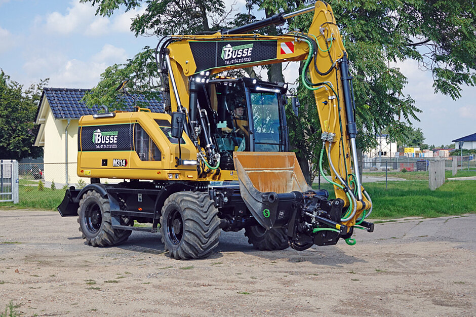 Mit dem Cat-Bagger will er anderen Bauunternehmen seine Arbeitsleistung im Straßen- und Tief- sowie Rohrleitungsbau anbieten. Der erste Einsatz führt den Mobilbagger nach Eisenhüttenstadt, wo in den Schutzstreifen einer bestehenden Gasleitung vier Leerrohre eingefügt werden. Er muss Startgruben für den Kabelpflug öffnen und wieder verfüllen sowie die Oberfläche wiederherstellen. Busse schwebt vor, auch Aufträge für Kommunen anzunehmen sowie in die Land- und Forstwirtschaft einzusteigen. Darauf ausgerichtet hat er den Cat M314 mit dem Tiltrotator X18 und einer Greiferzange von Steelwrist.