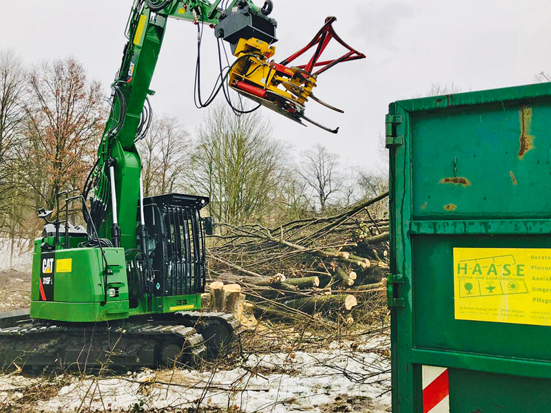 Die Haase-Maschinenausstattung hilft dabei, Gartenträume umzusetzen. »Für jede Tätigkeit haben wir das passende Gerät«, so die junge Unternehmerin. Das sind Cat-Minibagger, wie ein 300.9D, drei 301.7D, zwei 301.8, ein 304C CR, ein 305.5E CR, ein 308E2 CR, ein Kettenbagger 315F L, ein Mobilbagger M313D, drei Radlader 906M sowie ein Telehandler TH414C. Auch in der Haase-eigenen Straßenbaufirma sind diese präsent, wie sich anhand eines 906H, 906H2 und 301.7D zeigt. Aufgewertet werden die Baumaschinen durch einen Aufreißzahn, einen Mulcher oder eine Baumschere.