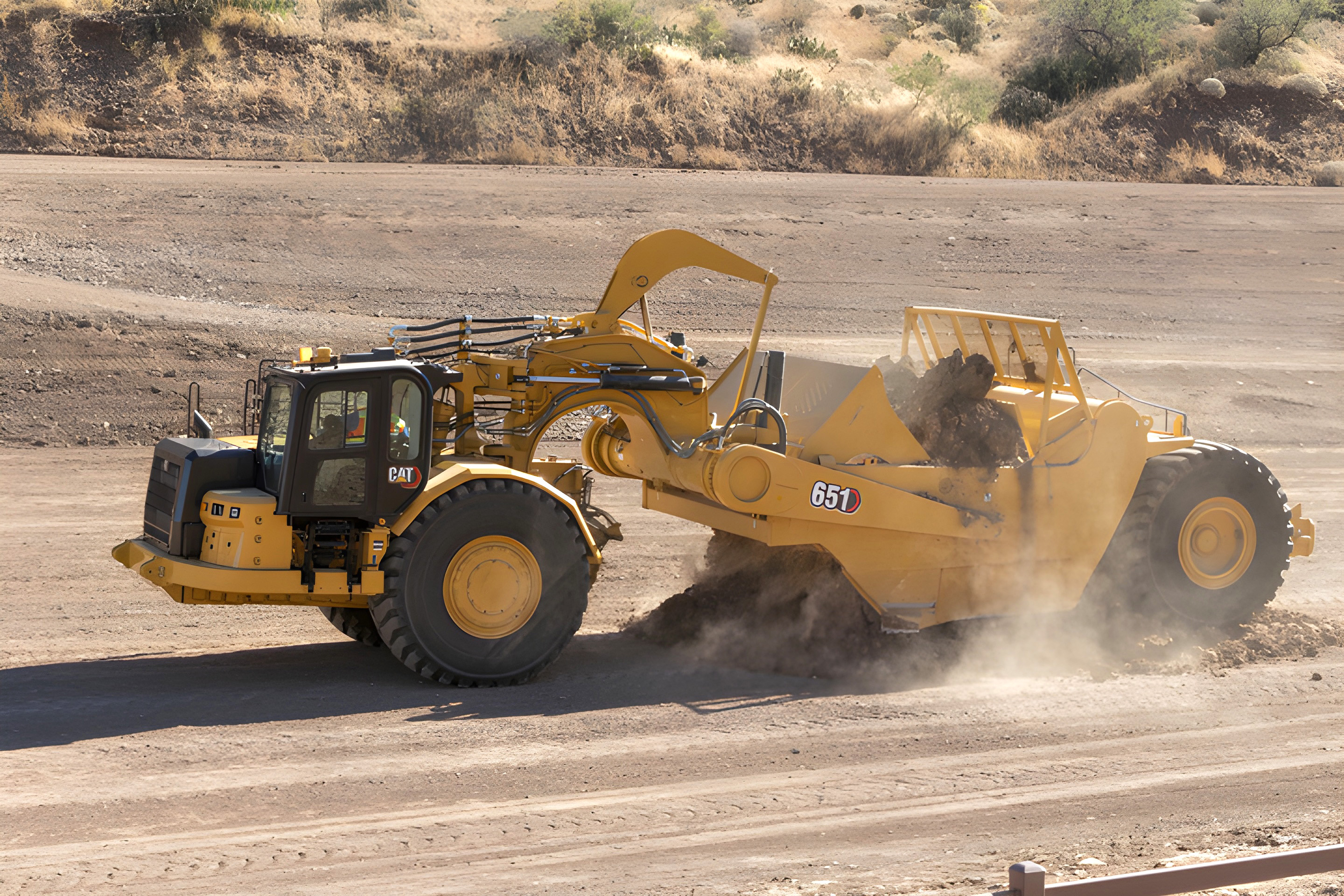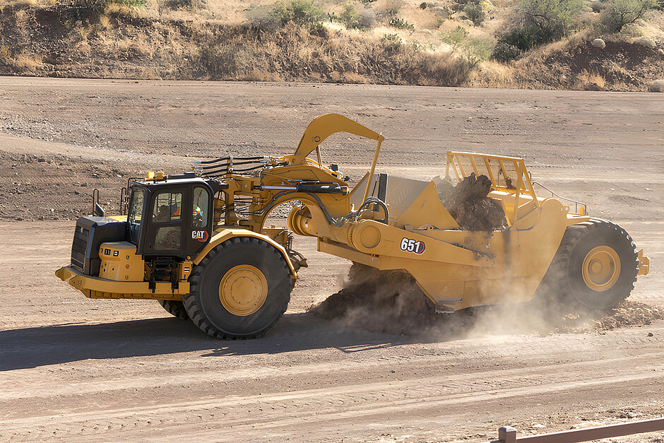 Der einmotorige Schürfzug Cat 651 wurde ganz neu entwickelt. Antriebsstrang, Steuerung, Hydraulik und Rahmen wurden überarbeitet, um eine hohe Produktivität und niedrige Betriebskosten zu gewährleisten. Die neue Transportmaschine, meist in Flotten für lange, ebene Transportstrecken von 200 bis 2500 Meter Länge eingesetzt, kommt mit einem Fassungsvermögen im Schürfkübel von 33,6 m3 gehäuft und einer Nutzlast von 46,4 Tonnen und kann somit mit dem Muldenkipper Cat 773G verglichen werden. Besonders in Sand- und Tonböden erzielen diese Maschinen hohe Abtrag- und Transport-Leistungen.