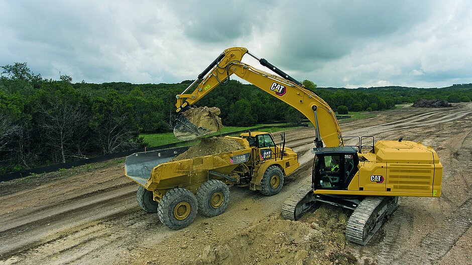 Der Cat 352 kann mit einem großvolumigen Löffel ausgerüstet werden, mit dem sich große Materialmengen in wenigen Ladespielen bewegen lassen. »Aber genauso ist er ausgelegt für einen großen Hammer und anspruchsvolle Anwendungen in Steinbrüchen«, betont Brian Abbott. In puncto hoher Grabkraft soll dem 352 der eine Nummer kleinere Cat-Kettenbagger 350 nur wenig nachstehen. Dank eines starken Schwenkmoments erreicht er eine laut Zeppelin in seiner Klasse führende Produktivität. Dabei verbrauche er bis zu 13 % weniger Kraftstoff als das Vorgängermodell Cat 349, was die Kosten senkt, die CO₂-Emissionen verringert und einen nachhaltigeren Betrieb ermöglicht.