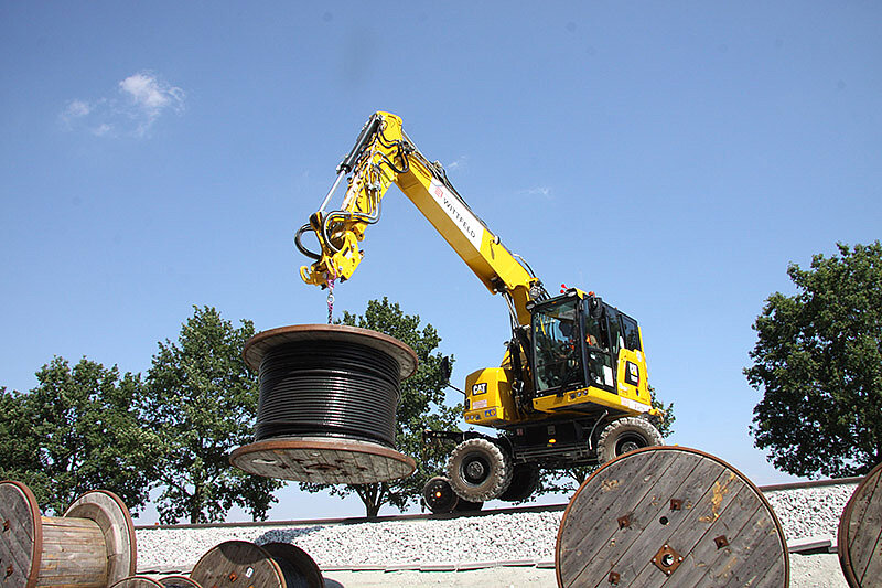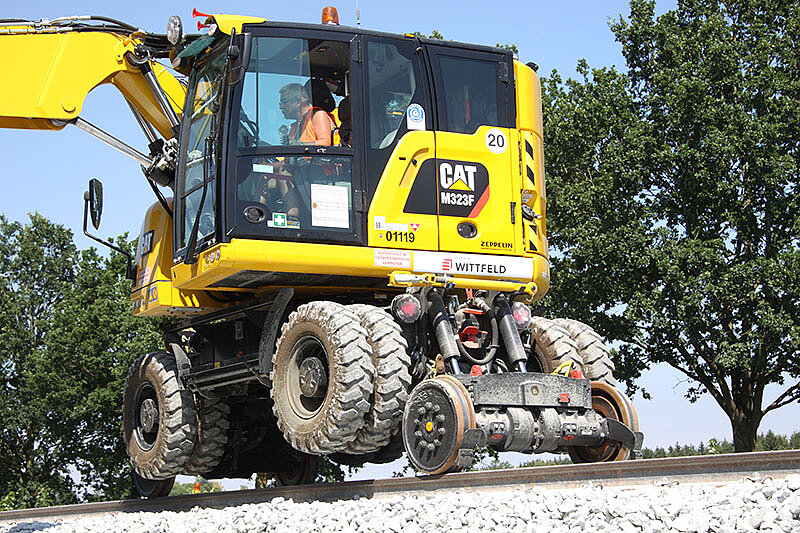 Weil bislang Erfahrungswerte damit fehlten, ging dem Gerät ein Test auf der Baustelle PFA4.1 voraus. „Wir wollten wissen, wie stabil steht der Bagger? Welche Lasten lassen sich damit heben und wie schnell sind wir damit auf dem Gleis unterwegs? Er hat dabei einen ersten guten Eindruck gemacht, auch wenn ich zunächst dachte, dass das Heck ganz schön hoch ist“, so Wittfeld-Bauleiter Florian Asbeck, zuständig für den Bahnbau. Doch dafür ist der Aufbau kompakt und dank der Heckausladung von nur 1 575 Millimetern kann der Schienenverkehr auf dem Nachbargleis problemlos weiterlaufen – so wie es auf dem PFA4.1 erforderlich ist. Neu ist an dem Cat M323F sein hydrostatischer Schienenradantrieb an beiden Gleisachsen. Hydraulisch betriebene Motoren treiben die Schienenführungsräder direkt an. Eine hohe Bodenfreiheit trägt dazu bei, die Sicherheitseinrichtungen im Gleisbett beim Fahren nicht zu tangieren. Mit dem beidachsigen Bremssystem im Ölbad und den Scheibenbremsen für alle Gleisräder gewährleistet der M323F sichere Fahreigenschaften.