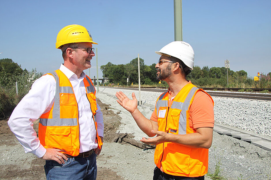 „Wir liegen gut im Zeitplan“, so das Zwischenfazit von Asbeck. Trotzdem kamen die Mitarbeiter in den letzten Wochen schon ganz schön ins Schwitzen, was alleine an der sommerlichen Hitze lag. „Da haben wir Arbeitszeiten dementsprechend angepasst“, ergänzt der Bauleiter. Dem Team wurde auf den Baustelleneinrichtungsflächen zusätzlich zu der normalen Getränkeversorgung gekühltes Wasser bereitgestellt. Aber auch der eingesetzte Wasserwagen fuhr unentwegt auf den Baustraßen, um diese für die Materialtransporte zu bewässern und Staubbildung einzudämmen. Diese befinden sich zwischen Bahngleis und Autobahn A29. „Das Sicherheitsrisiko wäre sonst zu groß“, räumt Asbeck ein.