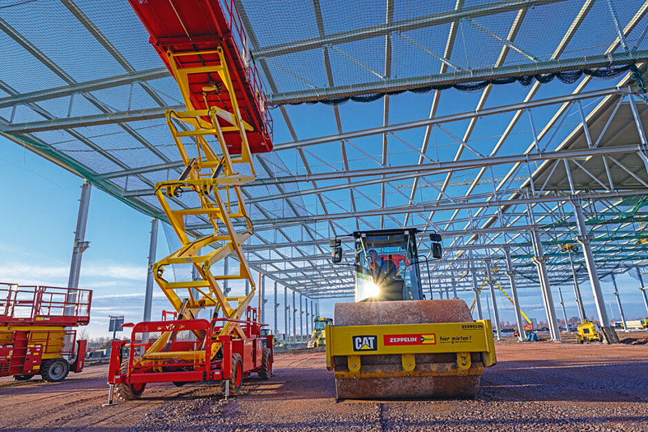 Für die Stahlkonstruktion der Industriehalle hat sich P.A.B. von Zeppelin Rental Unterstützung durch zahlreiche Arbeitsbühnen gesichert: Zwei Gelenk-Teleskopbühnen mit einer maximalen Höhe von 21 m, zwei Teleskopbühnen mit einer Reichweite von 17 m und acht Teleskopbühnen mit einer Reichweite von 21 m ermöglichten mit sechs selbstfahrenden Scherenbühnen ein flexibles und simultanes Montieren. Eine der Scherenbühnen verfügt durch eine Plattformvergrößerung über ein 7 m langes Superdeck, auf dem bis zu fünf Monteure arbeiten. Die Sicherheitsgurte an den Körben und Plattformen der Arbeitsbühnen sorgen für den Schutz bei der Montage in luftigen Höhen. Gleichzeitig musste auch der Baufortschritt am Boden nicht ruhen. Für die Erdarbeiten stellte Zeppelin Rental zwei Cat-Radlader, einen 906H und einen 950M, einen Cat-Kurzheck-Mobilbagger 315F CR, einen Cat-Kettenbagger 320, einen Cat-Minibagger 305 E CR, einen Rad-Dumper, eine Cat-Planierraupe D6K LGP und einen Cat-Walzenzug CS-64B zur Verfügung.