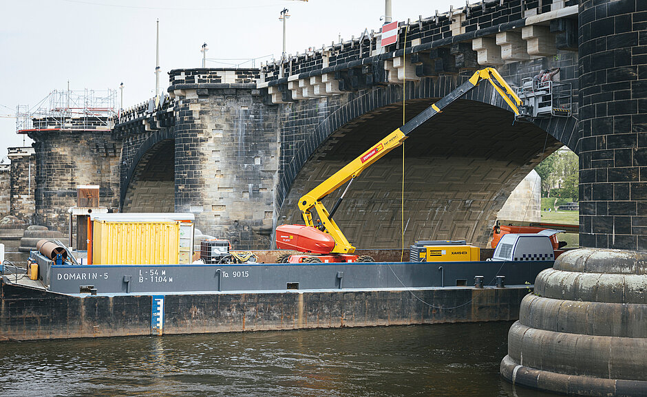 Nachdem die Fördertechnik mit einem Hafenkran verladen wurde, brachte ein Schubschiff die Plattform zum Einsatzort. An der Augustusbrücke angekommen, konnte die Inspektion und Instandhaltung der Stirnflächen und der Unterseite realisiert werden.