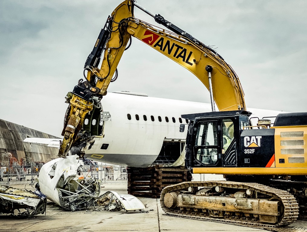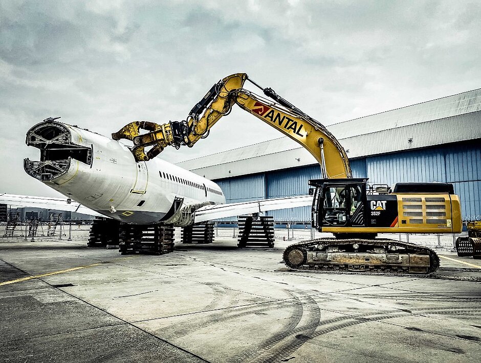 Flugzeug-Rückbau mit dem Cat Kettenbagger 352F