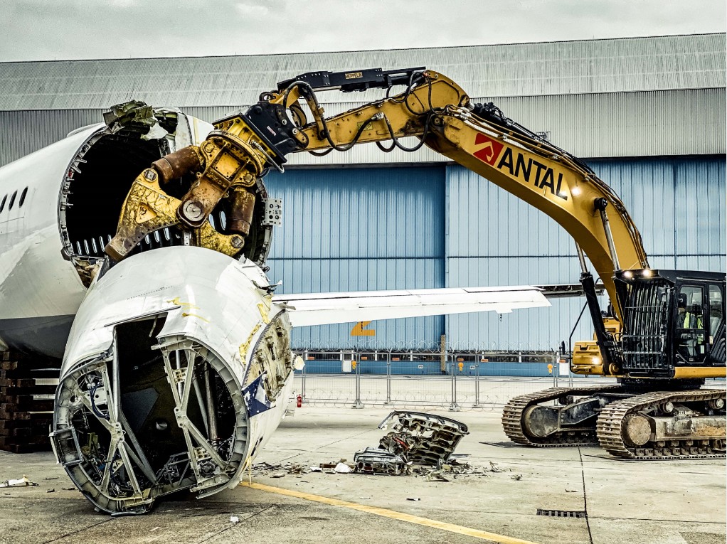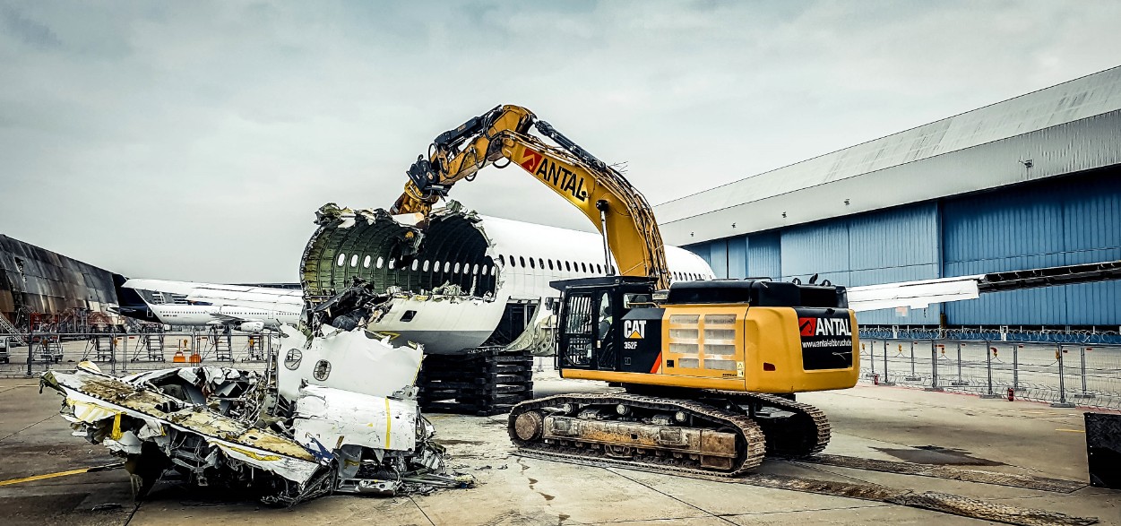 „In knapp einem Tag hatte der Bagger die Arbeiten erledigt – deutlich schneller als wir eigent-lich geplant hatten“, meint Antal-Projektleiter Daniel Deigert. Auch wenn es für Bagger und Maschinist keine Routineaufgabe war, so war es für die Abbruchfirma kein Neuland. Der A319 war nicht das erste Flugzeug, das rückgebaut werden musste. Schon in der Vergan-genheit hatte Antal mit einem Airbus zu tun, als ein A340 auseinandergenommen werden musste. Mit dem Zerschneiden des großen Vogels konnte der Cat 352F beginnen, nachdem das Flugzeug entkernt worden war. Das hieß: Die einzelnen Komponenten und Bauteile sor-tiert nach Materialien auszubauen und nach Legierungen entsprechend zu separieren sowie Verbundstoffe wie Aluminium, Titan, Kupfer, Kunststoff, Elektroschrott und Sonstiges für den Sekundärkreislauf vorzubereiten.