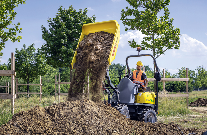 Völlig emissionsfrei arbeitet der Raddumper DW15e von Wacker Neuson, den Zeppelin Rental derzeit in seinen Mietstationen testet und demnächst zuführen wird. »Die bewährten und wartungsarmen Blei-Säure-Vlies-Akkus haben eine lange Lebensdauer. Zudem kann der Dumper problemlos einen ganzen Arbeitstag lang ohne Nachladen betrieben werden«, betont Sebestyén.