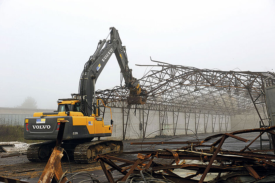 Ein Volvo-Raupenbagger des Typs EC240C, zwei Mobilbagger, Minibagger, Radlader sowie rund 20 Kleintransporter für Werkzeuge und Kleingerätschaften zählen unter anderem zum Fuhr- und Maschinenpark der Usedomer. Für einen Abrissauftrag in Hagenow brauchte Hagemann zusätzliche Verstärkung. Hier sind Dimensionen gefragt, die der Volvo-Mietpark von Swecon smartrent in Form eines Raupenbaggers EC220D mit Abbruch-Sortiergreifer parat hält. Ihm stellen sich drei alte Panzerhallen einer Kaserne entgegen, die es dem Erdboden gleichzumachen gilt. Im Anschluss muss Hagemann noch ein fünfstöckiges Bürogebäude auf dem Gelände entkernen und abreißen. Rund 0,5 Mio. Euro lässt sich der Bund den Abriss und die Entsorgung des Baumaterials und der verbauten Schadstoffe wie Asbest, Mineralwolle und Teerpappen kosten.