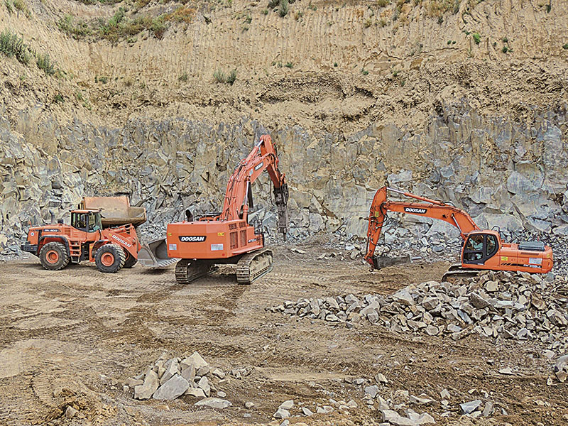 Ausgestattet mit einem 7-t-Hydraulikabbruchhammer, läuft der DX700LC in der Hochsaison und bei der Vormaterialherstellung täglich bis zu 20 Stunden im Steinbruch. Um den Fahrer und die an der Maschine verbauten Zylinder vor herabfallendem Gestein zu schützen, wurden ein zweifach gefertigtes Kabinenschutzgitter sowie Gummi-Schutzabdeckungen an dem Koloss montiert. Nach rund 500 Betriebsstunden mit dem DX700LC zieht Krings ein durchweg positives Fazit: »Die Maschine läuft in der Grube Mendig absolut zuverlässig und problemlos. Wir konnten die Quantität der abgebauten Mengen mit ihr deutlich steigern. Auch kommt der geringe Kraftstoffverbrauch der Maschine unserem Unternehmen zusätzlich zugute. Und darüber hinaus haben wir bei unerwarteten Hochphasen jederzeit die Chance, unseren Fuhrpark flexibel um große Radlader, Bagger oder Muldenkipper aus dem Mietpark von Bobcat Koblenz aufzustocken.«