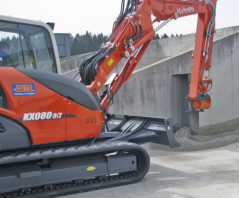 Bei der Überarbeitung der Minilöffel standen die Aspekte Materialersparnis, Funktionalität, Stabilität und Verschleißschutz im Blickfeld. Die Mini-Tieflöffel basieren nun auf einem doppelt gekanteten Kasten mit einem weit nach oben gezogenen Boden, der für optimale Planiereigenschaften übersteht. Die besonders beanspruchten Seitenschneiden werden durch eine Panzerung in HB 400 vor Verschleiß geschützt. Im Vergleich zu entsprechenden Modellen der alten Generation konnte das Füllvolumen erhöht werden. Die Messerstärke, die Verjüngung um 2,5° auf jeder Seite sowie die abnehmbaren Schraubzähne für Kabelarbeiten hätten sich, so Meindl, bewährt und wurden deshalb beibehalten.Die konstruktive Optimierung der Mini-Grabenräumlöffel machte es möglich auf eine Mittelsichel zu verzichten, ohne an Stabilität zu verlieren. Zusammen mit dem erweiterten Öffnungswinkel lässt sich Material so leichter dosieren und entleeren. Bei der Ausführung mit Zylinder verspricht die Verjüngung um 2° einen optimalen Freischnitt des Löffels. Das optionale Rückschlagventil wird nun zwischen Kastenrohr und Zylinder positioniert und ist damit besser vor einer möglichen Beschädigung geschützt. Die starre Ausführung des Grabenräumlöffels ist gekennzeichnet durch eine Verjüngung der Seitenwand um 4°. Als Ergänzung zum Schwenkmotor JR Tilt 90 ist die Seitenschneide vollständig aus Messerstahl HB 500 gefertigt. Wird der Löffel um 90° gedreht eingesetzt, ist er damit noch immer bestmöglich gegen Verschleiß geschützt.Entsprechend der Löffelklassen wurde auch die Produktreihe JR Tilt 90 um die Version des 390er ergänzt. Das kleinere Modell für Minibagger von 1,8 t bis 3,8 t verfügt über alle Leistungsmerkmale, mit denen die größeren Varianten 590 (bis 6 t), 790 (bis 8 t) und 1090 (bis 10 t) bereits im Einsatz punkteten. Dazu gehört die integrierte Öldurchführung, die es ermöglicht, hydraulische Schnellwechsler durch die Schwenkeinheit hindurch anzusteuern. Störungen durch Abreißen oder Beschädigungen der Hydraulikschläuche lassen sich so vermeiden. Zur Ansteuerung von hydraulischen Schnellwechslern bietet Rädlinger zusätzlich von der BG Bau zertifizierte nachrüstbare Hydraulikanbausätze und Pakete zur Hydraulikverschlauchung an.