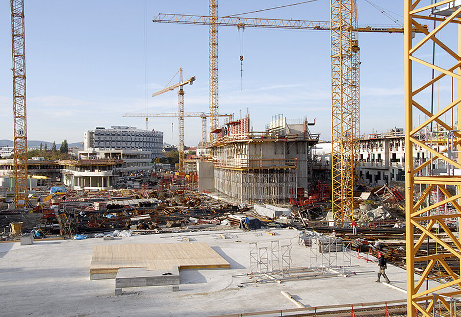 Die Baustelle ist unterteilt in drei Bereiche – Ost, Mitte und West –, die über eine Baustraße verbunden sind. Nachdem 260000 m³ Erdmaterial ausgehoben und die 7 m tiefe Baugrube fertiggestellt waren, starteten im Herbst 2010 die Hochbauarbeiten mit dem LLC. Im Verlauf der voraussichtlich bis Herbst 2013 andauernden Bauarbeiten werden von durchschnittlich 500 Arbeitern 15000 t Bewehrung und 150000 m³ Beton verarbeitet.