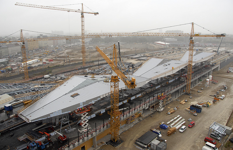 Herzstück des neuen Hauptbahnhofs ist eine 100 m lange und 25 m breite Halle. Eine fast gleich große Verbindungshalle mit direkten barrierefreien Zugängen zu den Bahnsteigen stellt kurze, komfortable Wege für die Reisenden sicher. Visueller Blickfang ist ein großes, modern gestaltetes Dach, das fünf Inselbahnsteige mit zehn Gleisen überspannt. Unter dem Gleisgeschoss wird auf zwei Ebenen rund 20000 m² Nutzfläche für ein attraktives Gastronomie-, Handels- und Dienstleistungszentrum geschaffen. Ein Stockwerk darunter entsteht eine Garage für mehr als 600 Autos. Die Gleisanlagen des Hauptbahnhofs erstrecken sich über eine Länge von 6 km. Der neue Hauptbahnhof, der den bisherigen Südbahnhof ersetzen wird, prägt das Stadtbild und auch die umliegenden Gebiete werden von dieser Entwicklung beeinflusst. Es entstehen 5000 neue Wohnungen für rund 13000 Menschen. Neugeschaffene Büroflächen summieren sich auf 550000 m². Mit angeschlossenen großzügigen Grünflächen, einer Vielzahl von Sozial- und Bildungseinrichtungen, optimaler Anbindung an öffentliche Verkehrsmittel und einem dichten Netz an Rad- und Fußwegen bildet sich eine Stadt in der Stadt, die hohe Lebensqualität für eine Wohn- und Arbeitsbevölkerung von rund 30 000 Menschen bietet. Im Sommer 2011 begann die Endphase der Bauarbeiten des Bahnhofes. Über 45000 m³ Beton flossen alleine in die Bodenplatte des rund 34000 m² Grundfläche umfassenden Bahnhofes. Um diesen enormen Bedarf an Qualitätsbeton bedarfsgerecht decken zu können, produzierte die baustelleneigene Liebherr-Betonmischanlage Betomix 3,0 bis zu 180 m³ Beton pro Stunde. Für große Bauteile wurden Ausstoßleistungen von bis zu 1200 m³ Beton pro Tag realisiert. Als Hebezeuge kamen bei den Hochbauarbeiten bis zu neun Liebherr-Turmdrehkrane vom Typ 280 EC-H 12 Litronic zum Einsatz. Sie stehen für hohe Umschlagleistung und können mit maximaler Ausladung von 75 m eingesetzt werden. Sie erreichen dabei Traglasten bis 2 800 kg an der Spitze. Unterstützend wurden zwei Schnelleinsatzkrane 42 KR.1 auf Raupenunterwagen eingesetzt.Je nach Bedarf fuhren diese Schnelleinsatzkrane mit ihrem kompakten Raupenunterwagen zum gewünschten Einsatzort. Großer Vorteil dieser Art von Kranen ist, dass sie auch stehend verfahren werden können. Dies spart Kosten und Zeit, da Montage und Demontage entfallen. Ein weiterer Pluspunkt ist, dass diese Raupenkrane mit ihrem Stromaggregat autark betrieben werden können. Sie erreichen durch diese Unabhängigkeit eine hohe Mobilität auf der Baustelle.