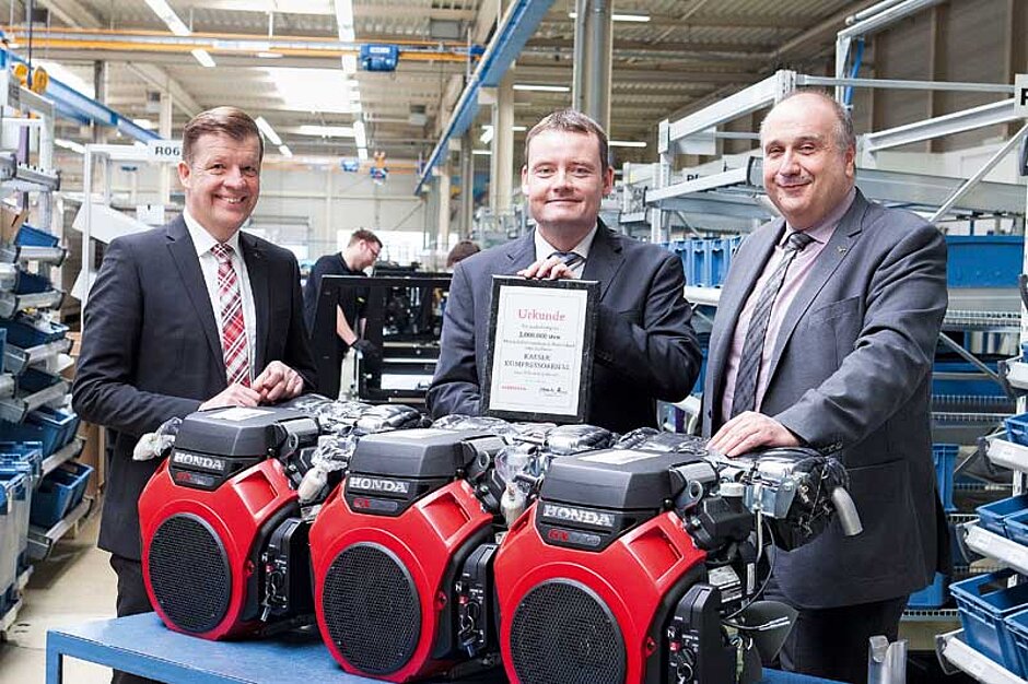 Im laufenden Jahr wurde der 2 000 000. Industriemotor, ein Zweizylinder GX630 mit der Motornummer GCAMH 1153204, an die Firma Kaeser Kompressoren geliefert. Der Motor wird künftig einen mobilen Baukompressor M17 antreiben. Ralf Hereth, Produktmanager im Hause Kaeser, meint dazu: »Unsere Kunden schätzen beim GX630 die hohe Zuverlässigkeit und die Leistungsstärke. Somit ist es der perfekte Antrieb für einen handlichen Baukompressor, der auf jeder Ladefläche Platz findet und für unterschiedlichste Druckluft-Anwendungen bei unterschiedlichsten klimatischen Bedingungen zum Einsatz kommt«. §