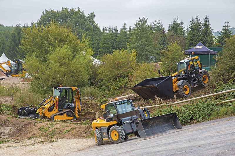 Staub, Steine und starke MaschinenJCB nutzte die Vorstellung der beiden Modelle 100 C-1 und 65 R-1 auch für eine Besichtigung der mehr als 100 ha großen JCB-Steinbrüche »Wardlow«, »Wreden« und »Kevin«, in denen Langzeittests der Heavy Equipment-Produkte durchgeführt werden. Hier waren rund 50 Maschinen vor der Kulisse des Steinbruchs zu sehen. Entsprechend war vom Mini-Teleskoplader 516-40 mit 1,6 t Nenntragfähigkeit bis zum 26 t schweren Kettenbagger JS 260 fast die gesamte Bandbreite des JCB-Sortiments dabei. Der neue kompakte Baggerlader mit Raupenfahrwerk 1 CXT bewies im unebenen Gelände seine Standfestigkeit und zeigte, wie er mit dem Grünschnitt auf der Schippe wendig zwischen Gebüsch und über Erdhaufen balanciert. Das neue Radlader-Flaggschiff 457 mit seinem Tier 4Final/EU-Stufe 4-konformem MTU-Motor und neuem Kabinendesign zeigte eine Kostprobe seines Könnens: Mit seiner großen Schaufel liefert er eine enorme Umschlagleistung und erreicht bereits in der Standardausführung eine Schütthöhe von rund 3 m.