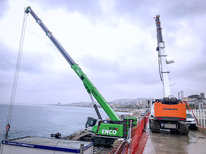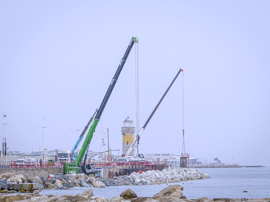 Denkt man an Cannes, hat man Filmfestspiele, die Croisette und den Yachthafen vor Augen. Doch auch Cannes hat mit für Küstenstädten alltäglichen Problemen wie Sturmfluten zu kämpfen, wie etwa am Quai Laubeuf und Quai du Large. Daher finden im Hafen von Cannes umfangreiche Renovierungs- und Verstärkungsarbeiten statt. Für die Hebeaufgaben auf der Baustelle entschieden sich die verantwortlichen Auftragnehmer, bestehend aus einem von TD Spada geführten Joint Venture aus Campenon Bernard / Gruppe Vinci, Razel-Bec / Gruppe Fayat und Negri für den Einsatz zweier SENNEBOGEN Raupentelekrane: ein von Vertriebs- und Servicepartner SYGMAT ausgelieferter 50 t sowie ein 120 t Kran kümmern sich um das Verheben und Verfahren der Lasten entlang der Promenade.